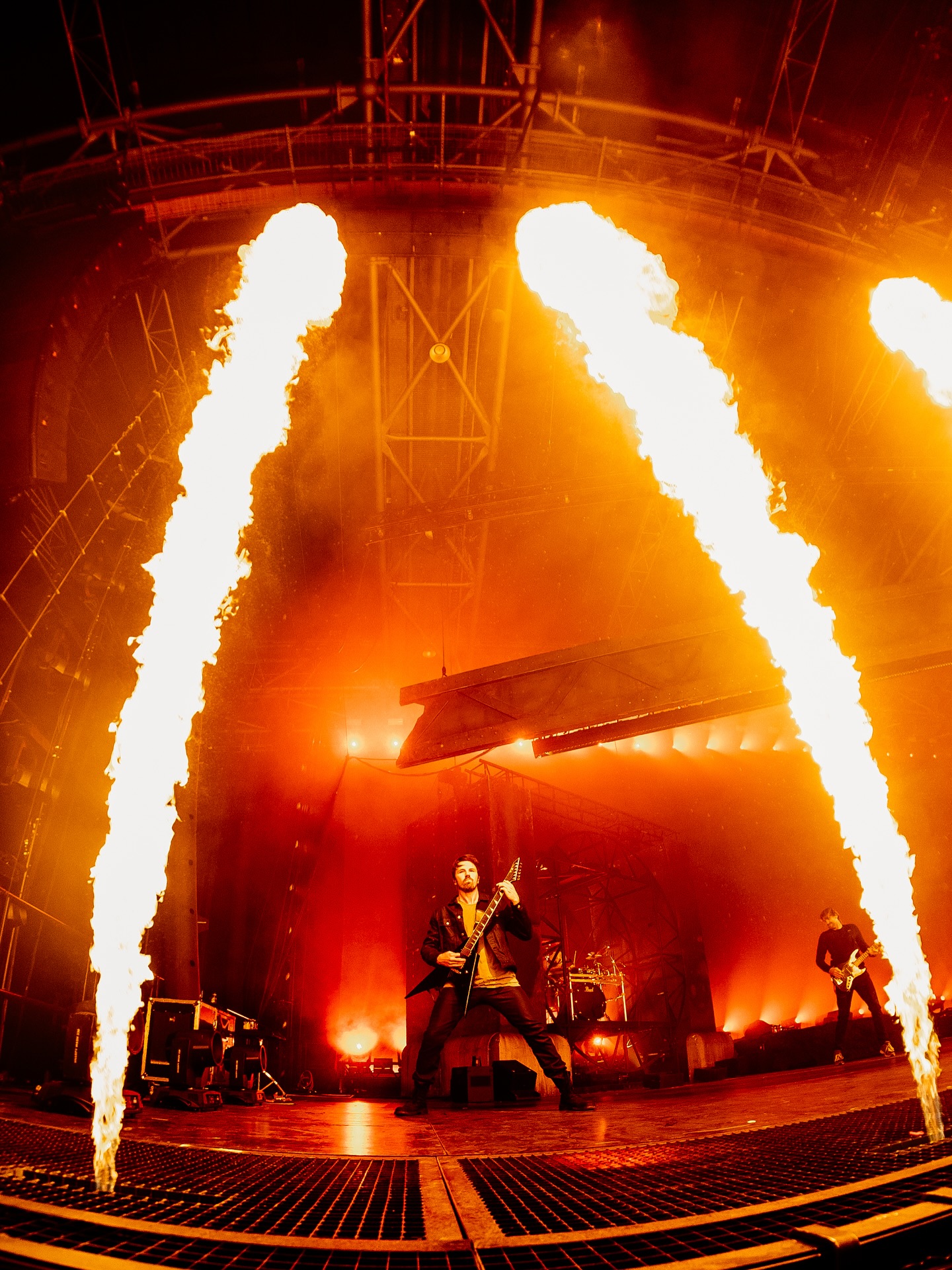 Et c'est à vrai dire assez logique. A l'heure où les places de concert sont particulièrement chères, Parkway Drive ne fait pas les choses au rabais dans le seul but d'augmenter ses marges. Le groupe est arrivé avec, dans ses bagages, une scénographie de grande qualité comprenant une petite scène centrale, un pont entre celle-ci et la scène principal qui n'aura cessé de monter et descendre pendant le show, une batterie en cage à la Joey Jordison de la grande époque, ou bien encore une scène très industrielle, avec une sorte de grand pont en metal qui la traverse. Ajoutez à tout cela des danseurs, des violonistes et de grands renforts d'effets pyrotechniques, pour un show complet.