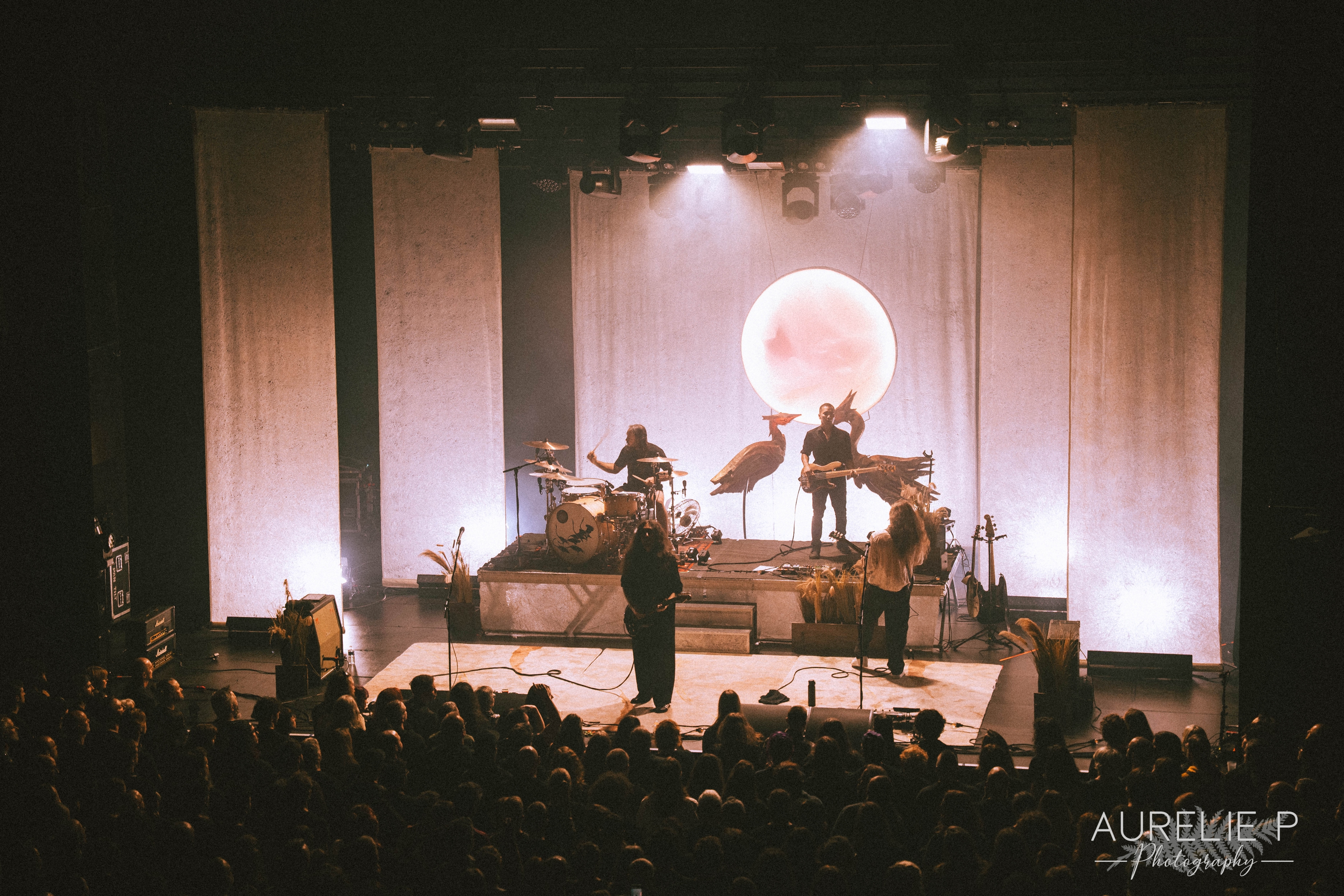 Une immense lune, des panneaux de tissus qui renvoient la lumière d'une manière onirique et des silhouettes d'oiseaux mi-grue mi-héron : il est indéniable que la scénographie adoptée pour Les Chants de l'Aurore est sublime. Les quatre musiciens évoluent dans cet espace, sans que Neige ne soit disposé comme frontman. Cela donne une place toute particulière au guitariste et chanteur qui l'accompagne et le complète, tant dans la disposition scénique que dans la répartition des lignes mélodiques.