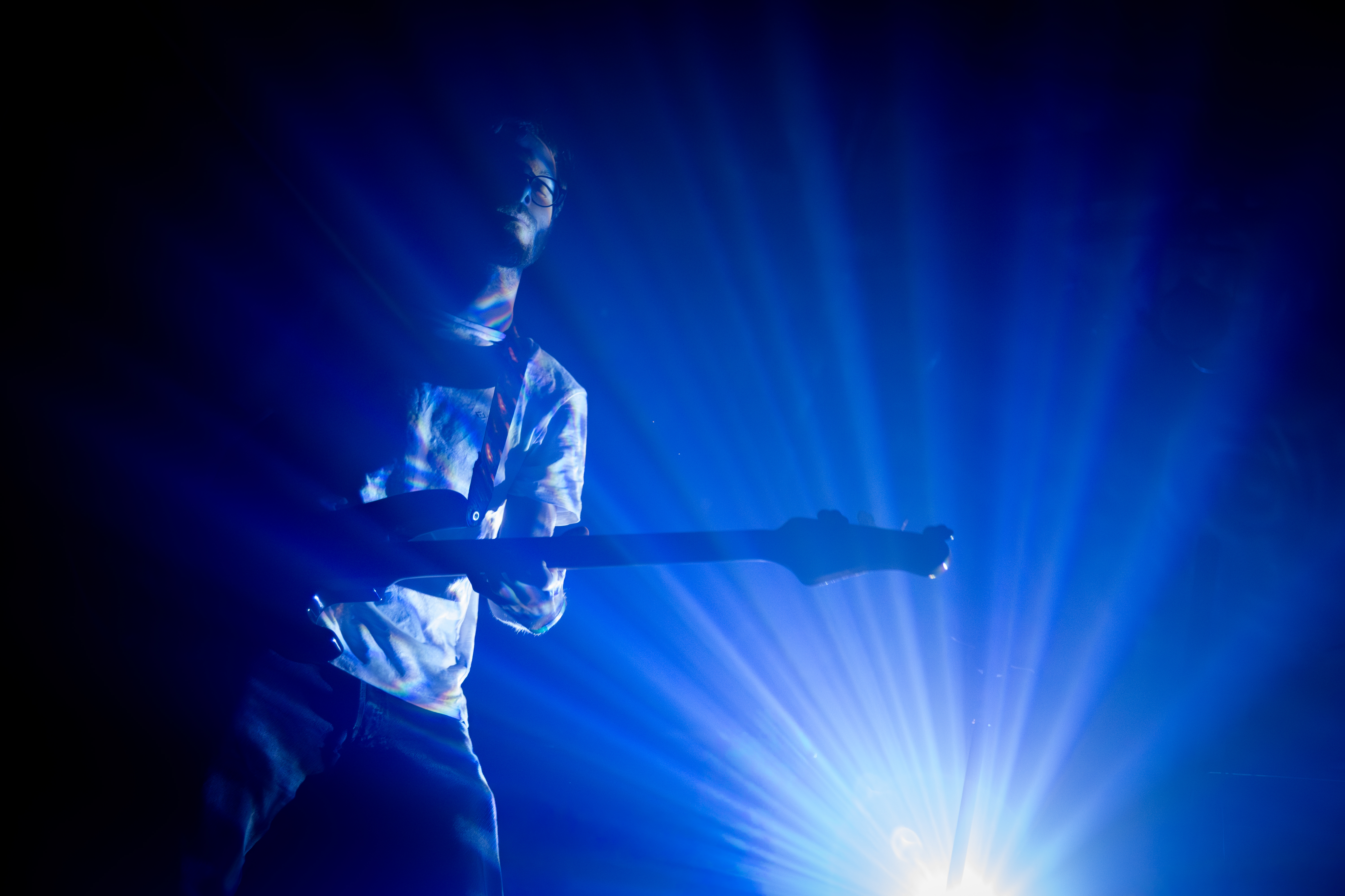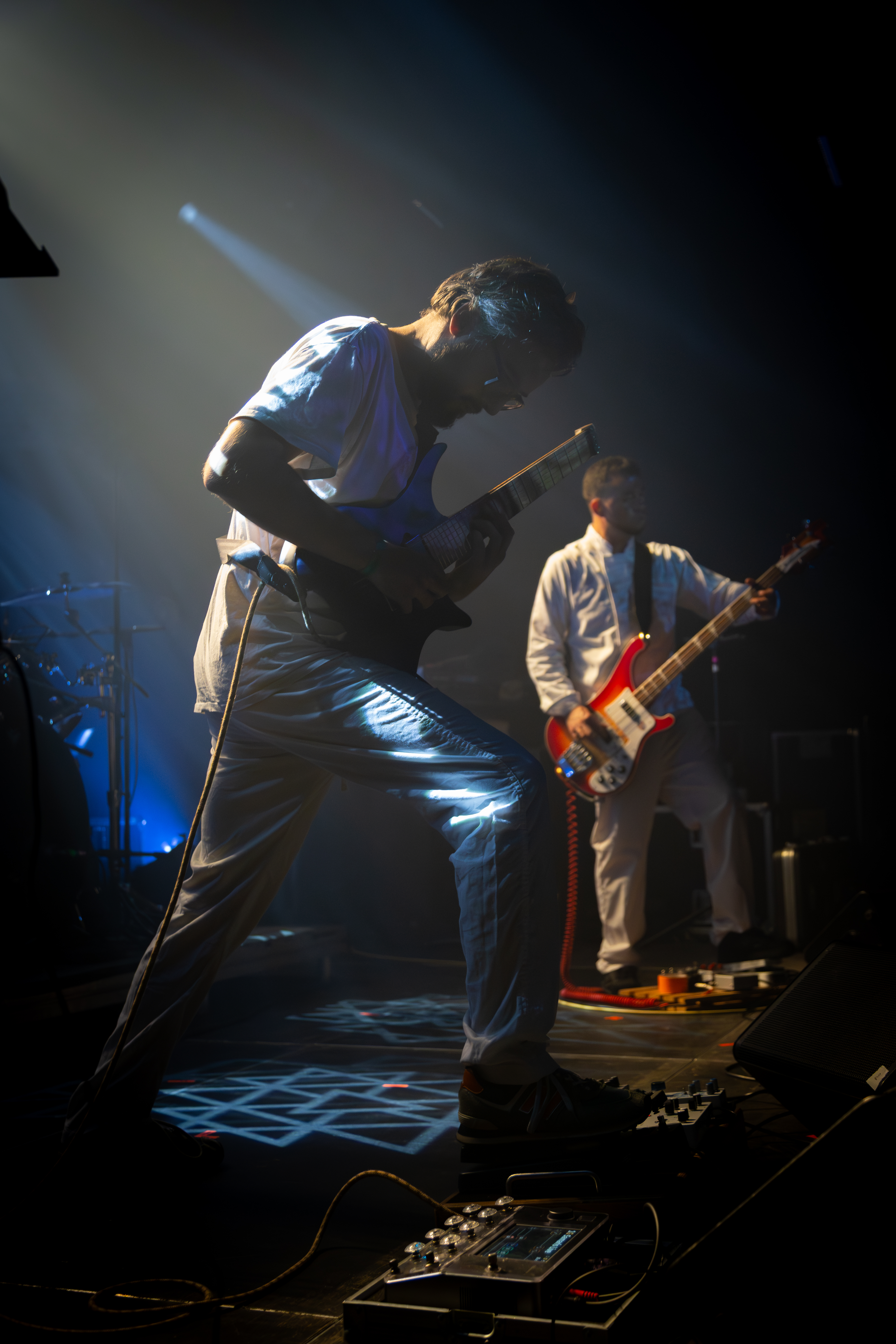 Le festival commence fort ce soir avec Cratophane, trio instrumental breton inspiré par la zeuhl, la musique psychédélique, les sonorités aussi lourdes que vaporeuses et la BD de science-fiction. Sans combinaison de cosmonautes sous la main, le guitariste Simon Bouin et le bassiste Ronan Grall donnent l’illusion avec leurs habits en blanc contrastant avec l’obscurité de la salle devant des projections d’images contre l’écran. Même une veste de chef-cuistot fait l’affaire pour nous porter à ébullition sur un live toqué étoilé.