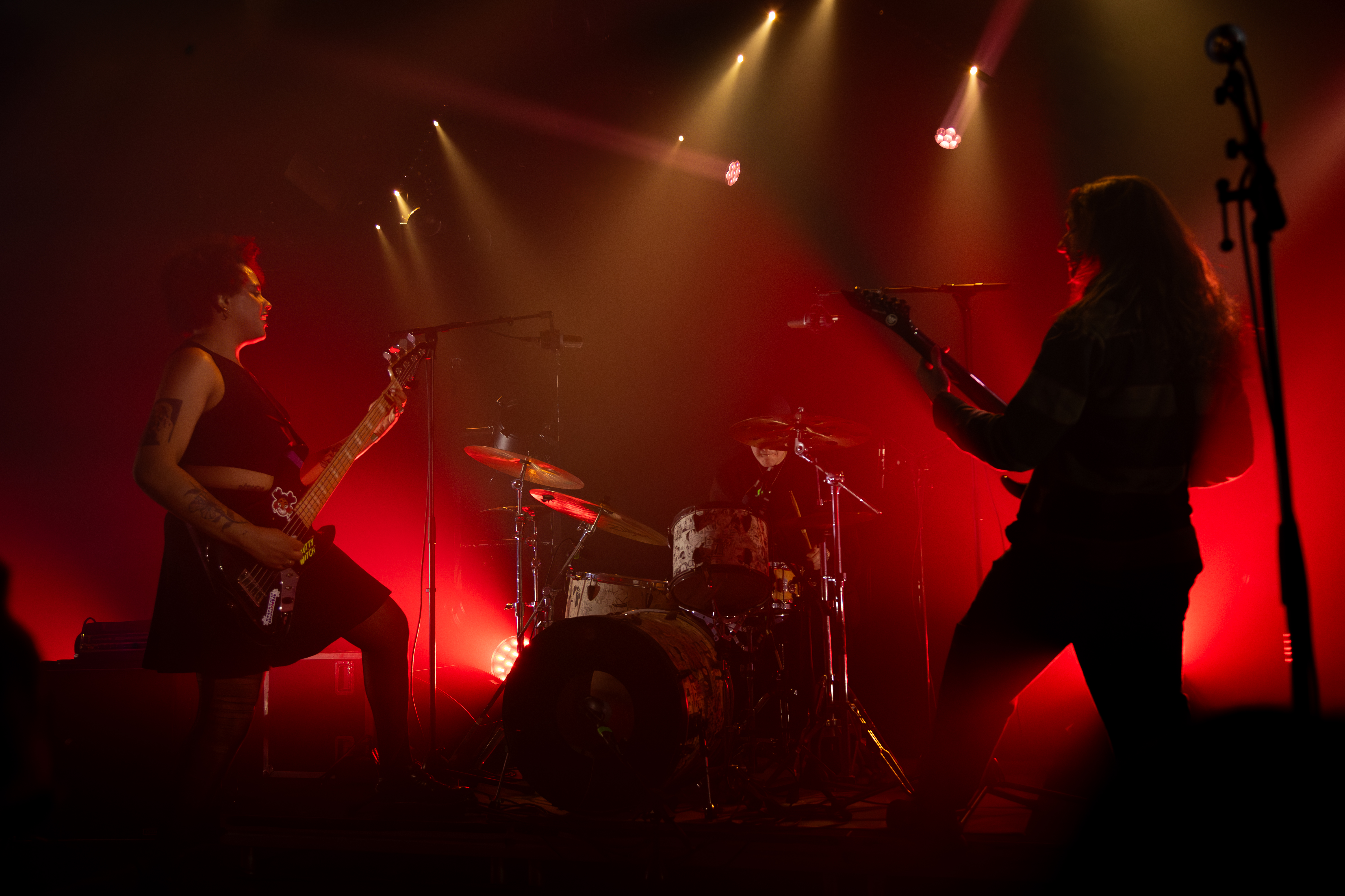 Vous associez des couleurs à des émotions ? Moi, non, mais sur ce concert, une couleur prédomine. Lumières orange, ambiance d’épouvante Halloweenesque, fausses bougies sur les amplis Orange, reflets roux, bière Witchorousse… Il y a un pattern, mon cher Watson. Élémentaires sont les riffs du trio doom, mais l’ambiance de vieux film d’horreur sacrificiel kitsch s’installe rapidement, dopée par l’énergie de la frappe de Paul Gaget avec des fills de batterie énervés. Plus saisissant sans toute la reverb en studio, le guitariste Antoine Auclair incarne au chant un véritable diablotin polymorphe, à l’aise en passant du chant clair au hurlé et appuyant parfois un débit appuyé vaguement nu metal, comme sur « Catharsis ».