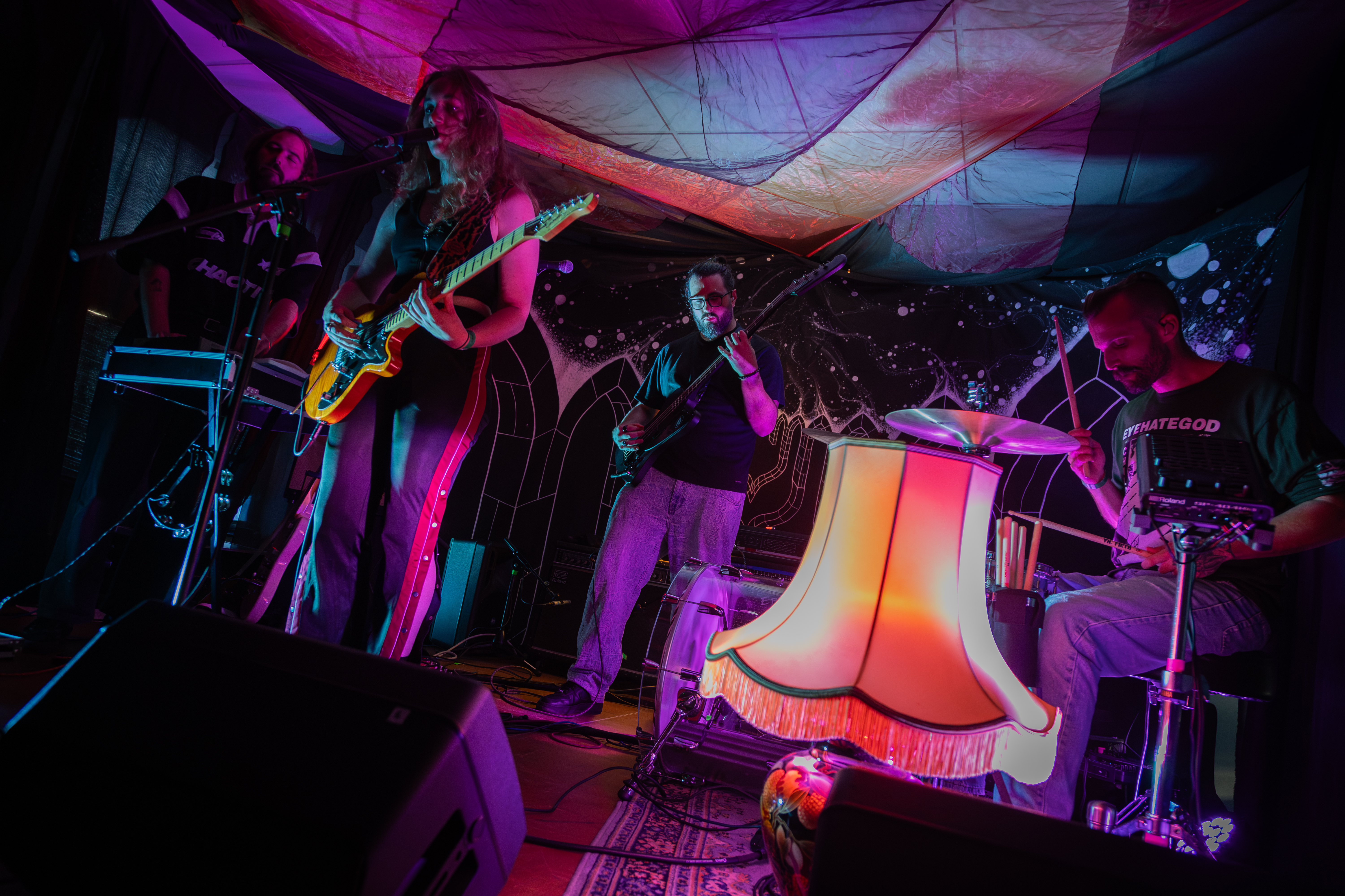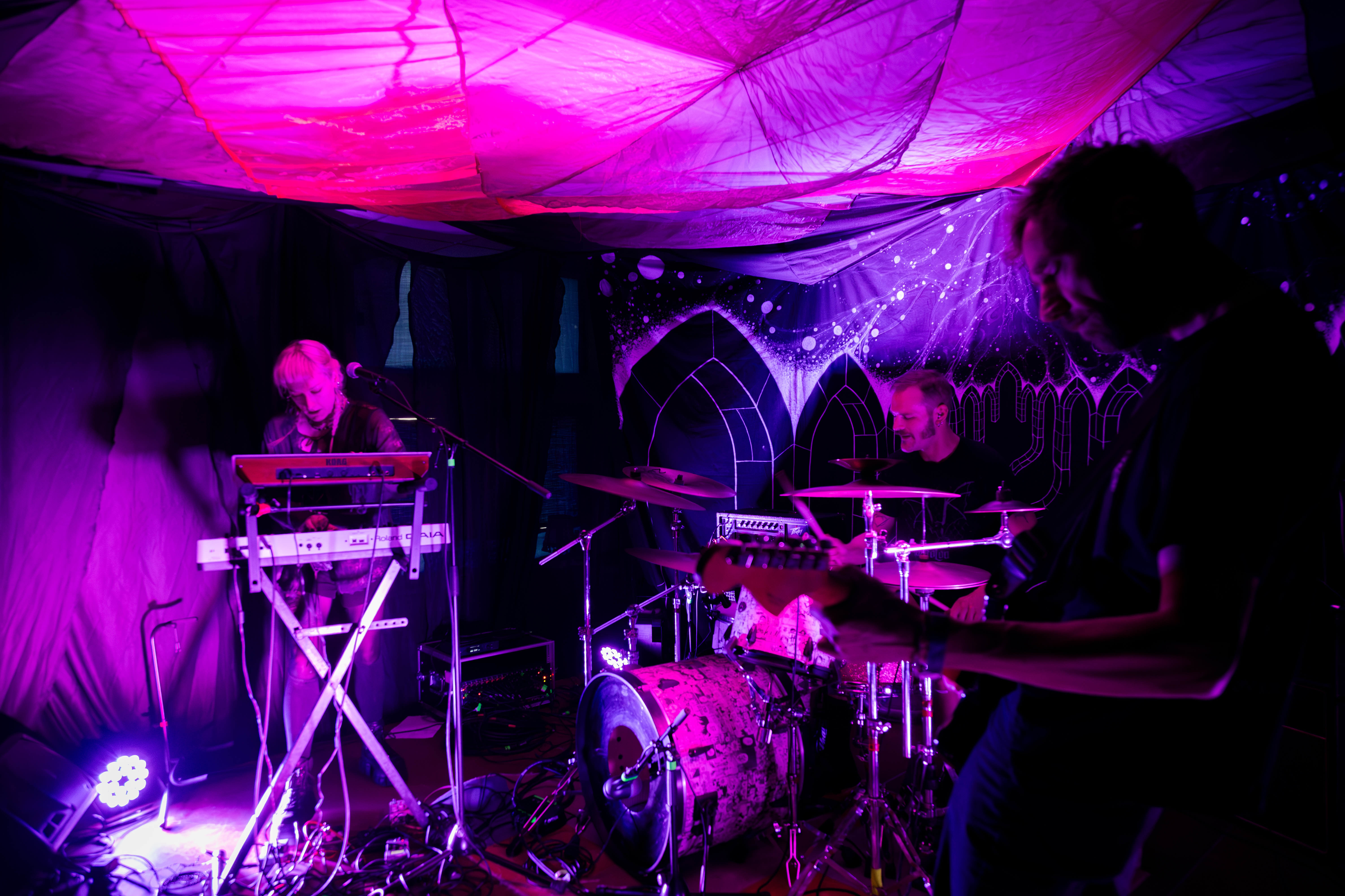 Face au bar qui a renommé sa carte d'après le nom des groupes programmés (« Pothamousse », « Witchorousse » pour les bières, « Lorsque les volconduisent » pour les softs, « Syl'wine », etc), l'événement compte également des exposant.es, artistes, artisan.es, tatoueur.euses, stand de disques, en plus du merch artiste et d'un stand de prévention bien préparé. L’ambiance safe se ressent sur place, fruit d’une politique affirmée et de l’implication de plus de femmes sur scène et à la technique sans discours de façade. La diversité se prolonge dans la programmation par les styles représentés aux différentes nuances de musiques obscures, post-metal/rock, doom, prog, indus, atmosphérique, avant-garde. Je regrette toutefois le fait de ne pas pouvoir prendre ma bière dans la salle principale. Il est certes possible de la déposer à l’entrée pour la retrouver (tiède) à la sortie, mais autant faire cul sec pour montrer patte blanche (avec modération).