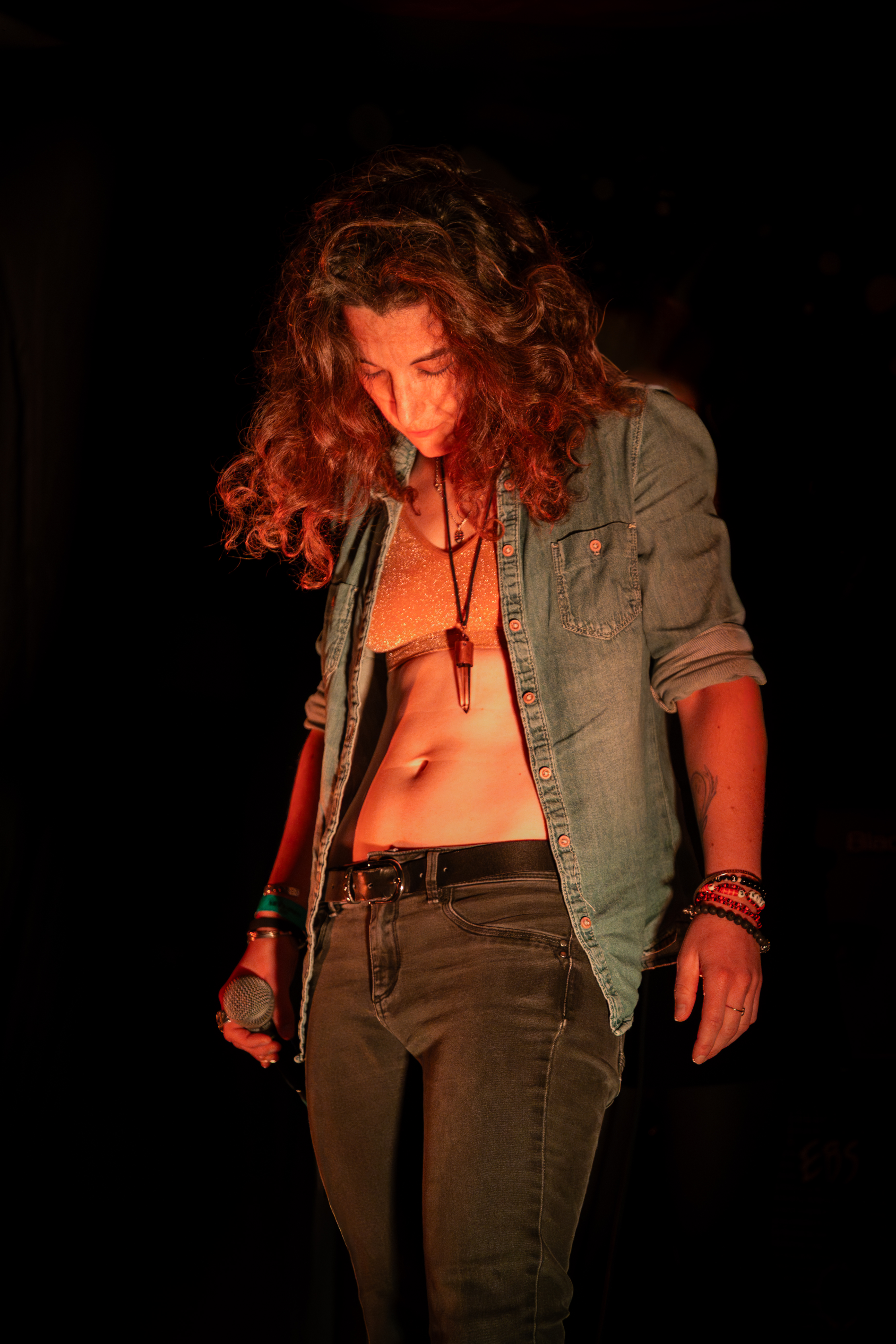 Je n’avais pas écouté au préalable les titres de ce collectif de « post traumatic rock » féministe afin de privilégier des émotions brutes de découverte en live. Les intervenant.es se succèdent sur chaque piste pour transformer les maux en poésie, prendre la parole et exorciser le vécu. Bande-son parfois fébrile de ces témoignages en spoken word y compris en italien, les guitares, piano, violon, trompette, samples et boîte à rythme s’effacent presque derrière la puissance des textes, au cœur de la performance. Sur « Volcan en torpeur », Adiel Goliot joue avec les mots « Stromboli/embolie/embellit » pour narrer son calvaire, tandis que « L’Œil du cyclone » avec son autrice Garance Ameline met en musique la résilience avec des accords majeurs qui donnent envie de chanter « Hey ! What’s going on ? » de 4 Non Blondes.