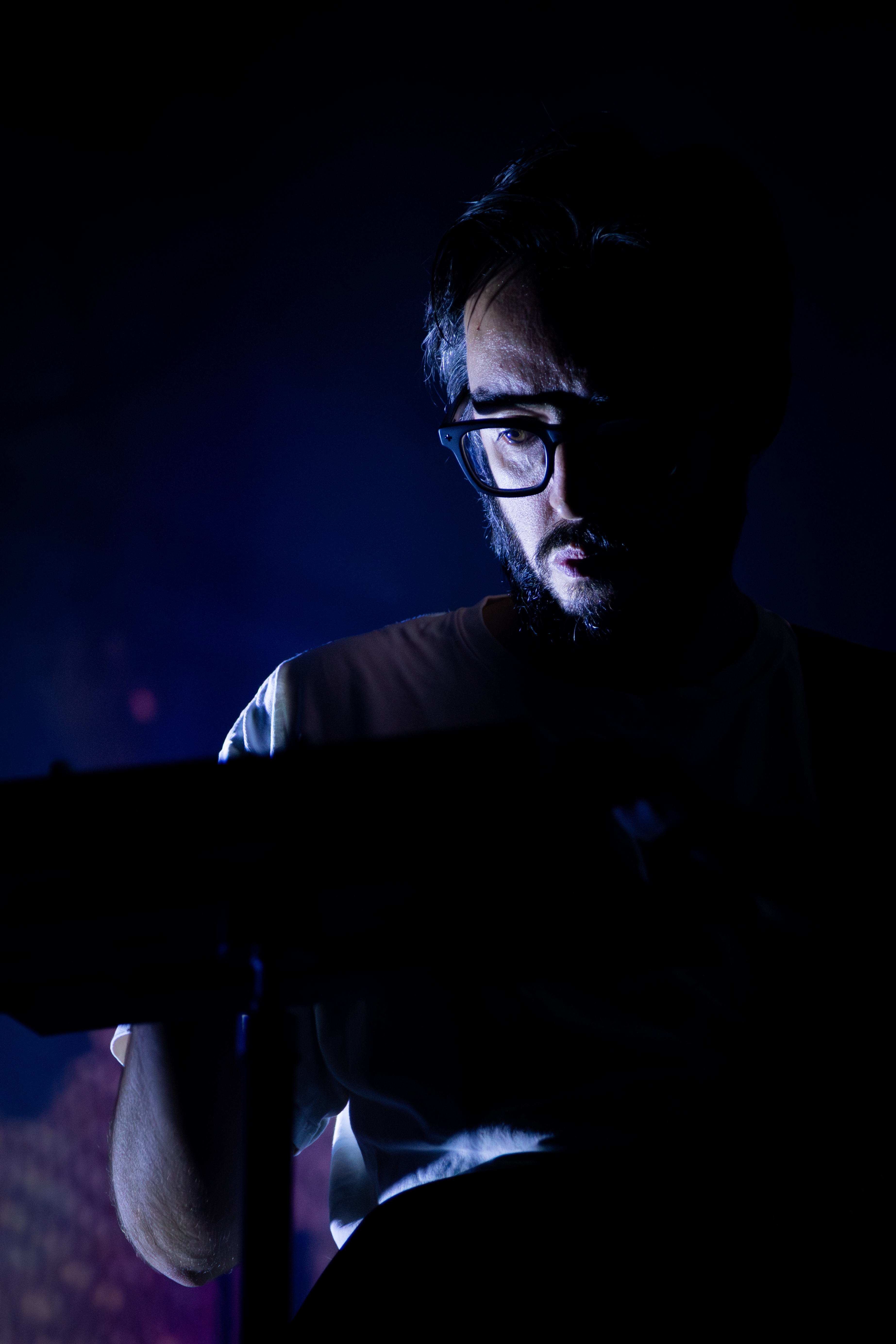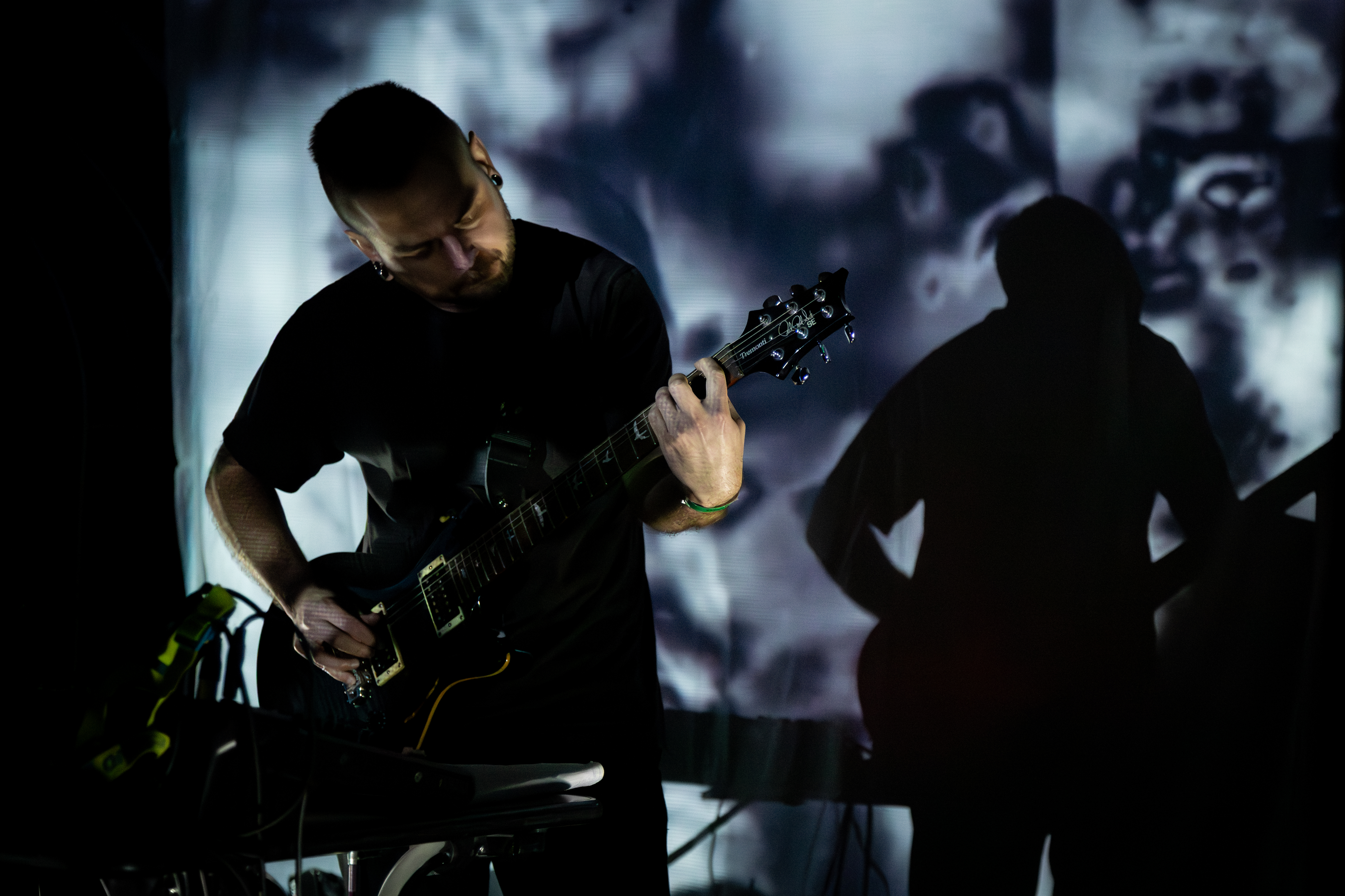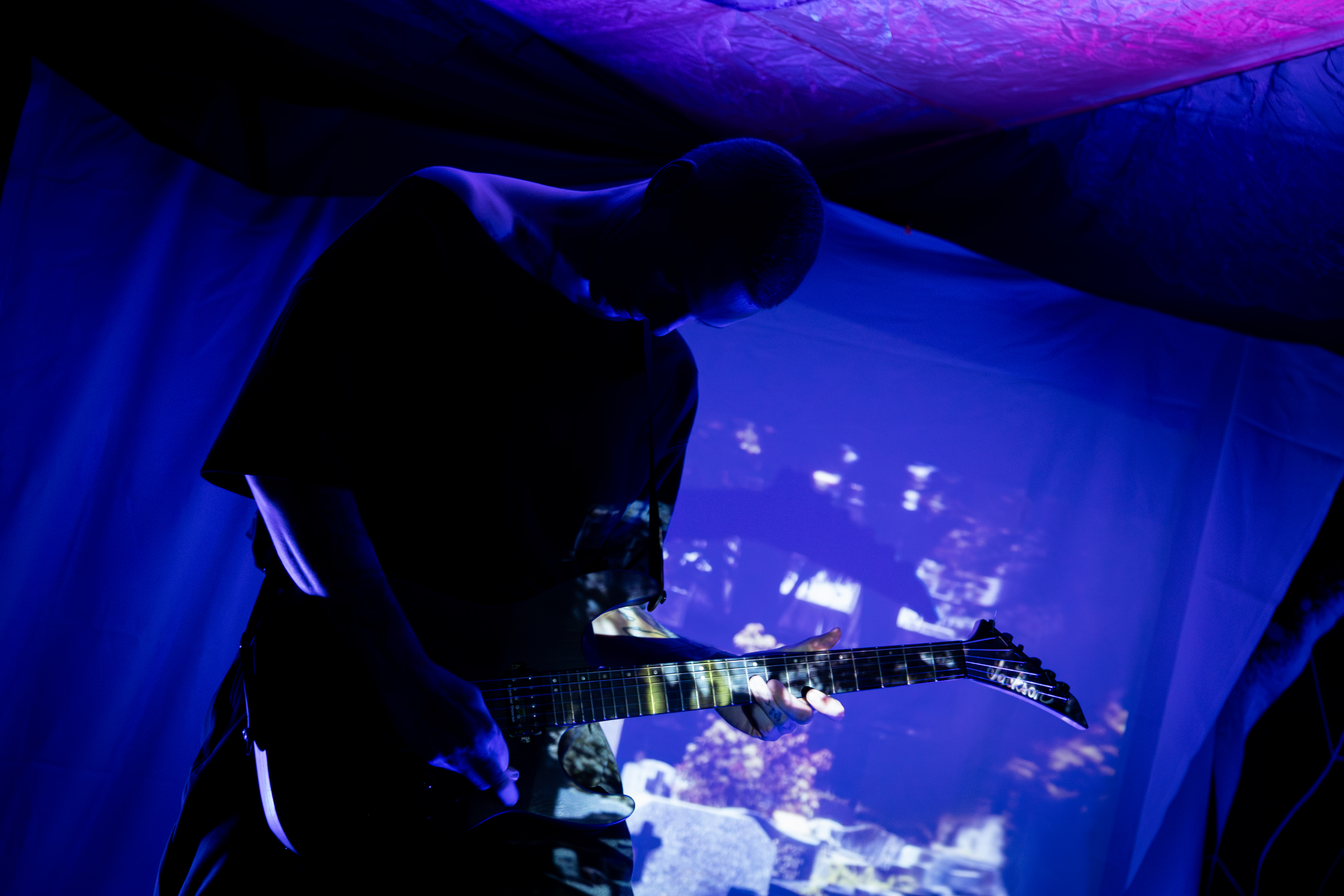 Seul sur scène, uniquement accompagné de samples et de projections d’images religieuses (intérieur d’église et vitraux), Guillaume Galaup se lance toujours à corps perdu dans sa performance. Telle une âme décharnée en phase de métamorphose, la tête levée au ciel quand elle n’est pas plongée dans ses tremolos électriques torturés et noyés dans le mix, l’artiste nous livre des cris glaçants derrière ses longues compositions black atmosphériques et viscérales tirées de son album Liernes, avec quelques passages de son précédent projet Blurr Thrower. Parfois crachés au public sans passer par le micro, ses hurlements fantomatiques nous hypnotisent et nous hantent encore après la fin du concert étendu comme un long bloc uni énigmatique qui s’achève abruptement. Devant une telle mise à nu, c’est le flagrant délit de voyeurisme qui nous guette. La salle Pluton est encore le théâtre de prestations à fleur de peau ce soir.