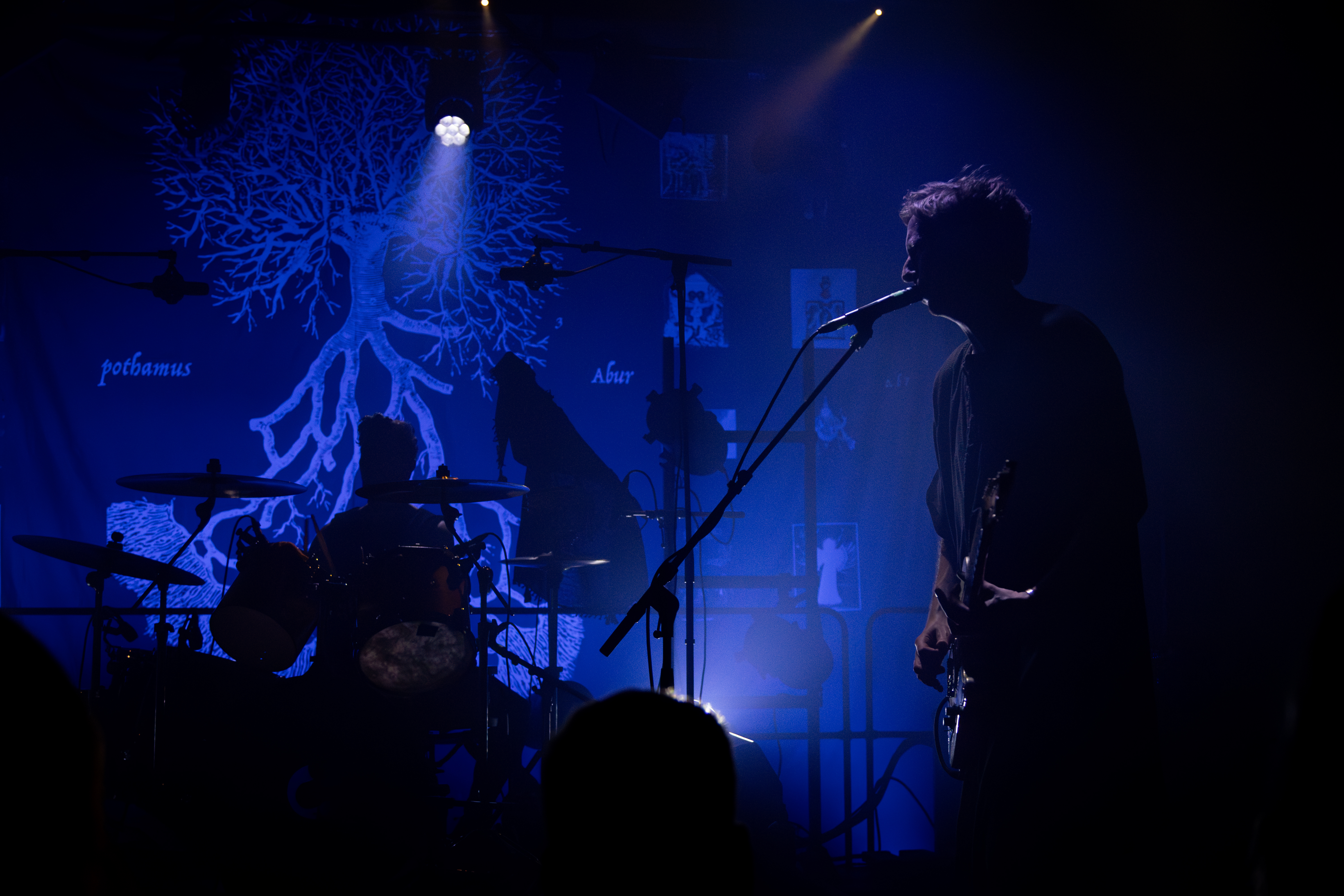 Je n’assiste qu’aux deux derniers morceaux du set des Belges de Pothamus, ayant effectué une interview avec Cratophane qui a débordé. On peut dire que j’arrive à l’Abur… Par chance les morceaux du groupe sont assez longs pour avoir un bon aperçu du show. Avec « Savartuum Avur » et les quinze minutes de « Abur », on atteint presque la moitié du concert. Autant dire que l’immersion est quasi instantanée, car avec de longs mouvements cérémoniels et une rythmique organique aux allures de procession sous des guitares nébuleuses, Pothamus parvient à attirer le public dans son rituel sans recours grossier à la mise en scène. On voit les musiciens danser face à face par-dessus la basse hypnotisante dans une atmosphère orientale enfumée. La caisse claire résonne avec fracas sur une reverb fortement appuyée pour donner un effet scandaleusement ahurissant. Je suis irrésistiblement conquis, mais je regrette tout de même que la voix claire de Sam Coussens soit moins noyée que sur le disque. L’entendre autant en avant ruine l’aura mystique du chant.