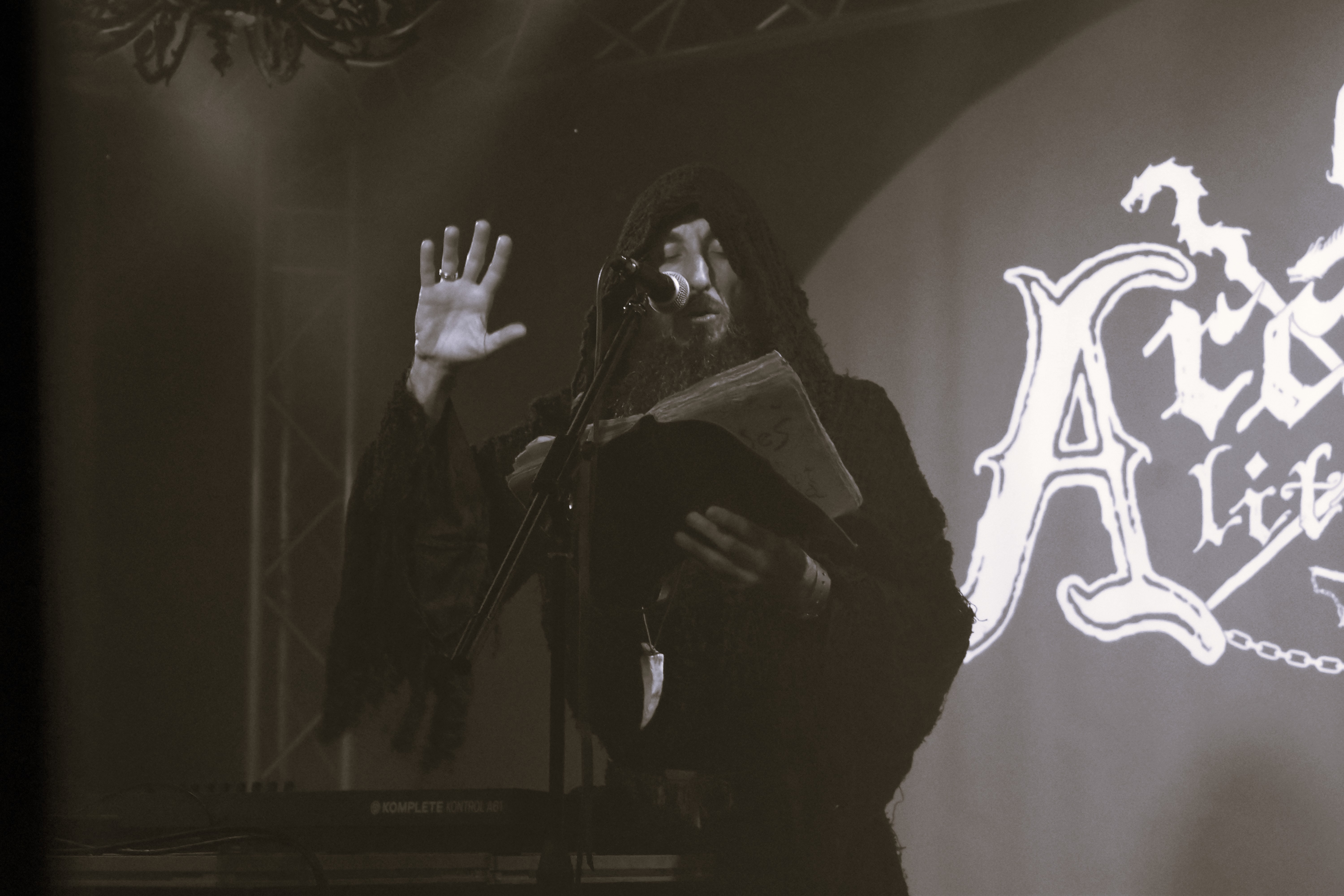 Endossé dans sa robe noire, l'artiste italien brandit son grimoire, comme pour une harangue ou un sortilège. Et pas n'importe quel sortilège : aussi loin que remonte la mémoire occulte, Arcana Liturgia est le premier projet de dungeon synth qui a vu le jour en Italie, en 1997. Après trois albums sortis au siècle dernier, il est ensuite entré en sommeil pendant vingt ans. C'est donc un événement de l'avoir sur scène aujourd'hui, alors que le sorcier de la Botte a repris une activité régulière et sorti cette année un remaster de Tales of an Ancient World, son album de la résurrection, en 2019.