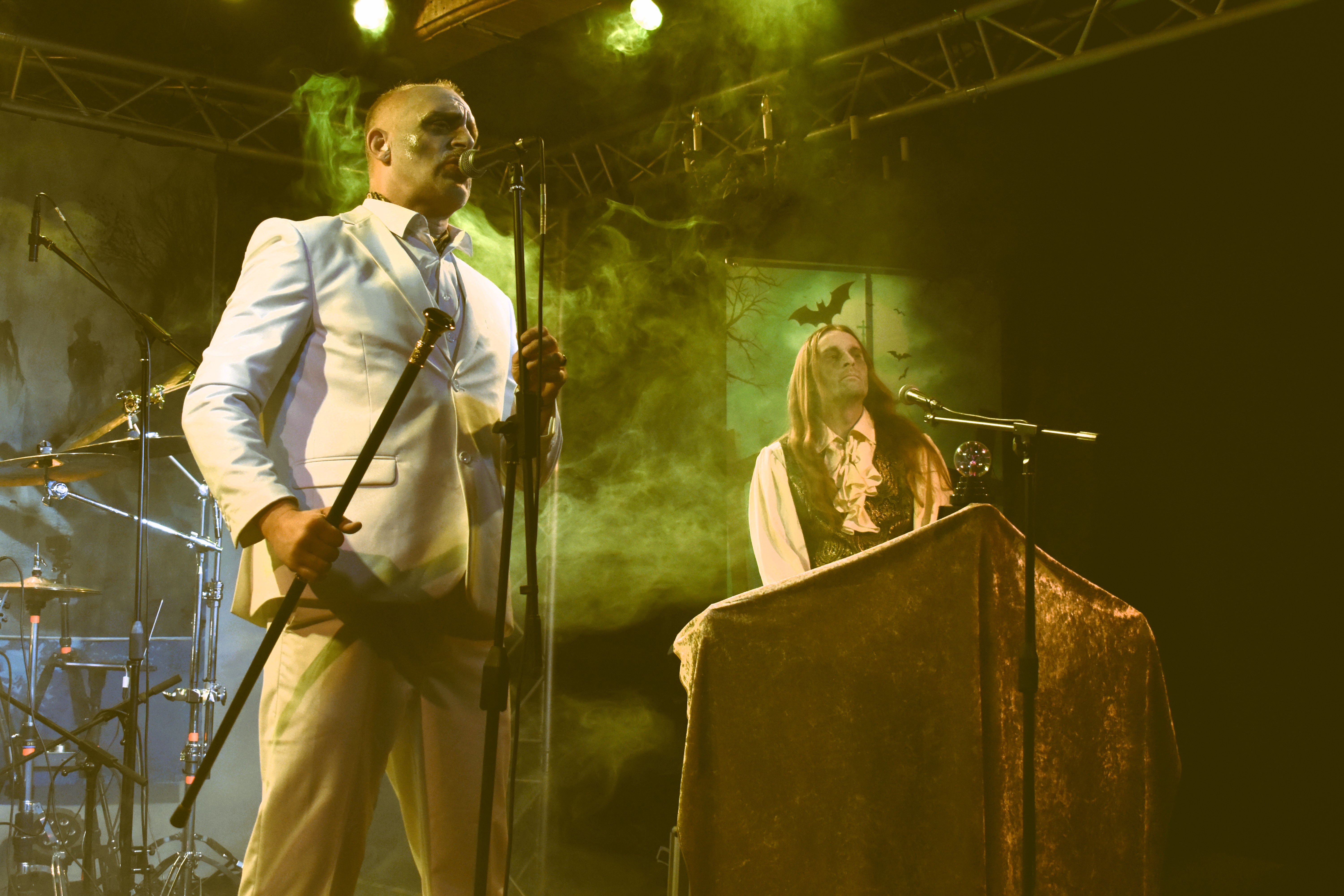 Alors certes, il est desservi par quelques soucis techniques, mais ses discours grandiloquents de Monsieur Loyal tombent quelque peu à plat, sur une si petite scène noyée par ses décors, tandis que ses musiciens, grimés jusqu'aux sourcils, n'ont pas l'air fort concernés. Chaque morceau est une scénette inspirée de récits d'horreur d’antan, illustrée par un couple que je suspecte d'être les grands ados du chanteur, pourquoi pas, mais là aussi, l'exécution souffre de longueurs accentuées par l'aspect intimiste des lieux. Dommage, et peut-être à revoir dans un autre contexte ; il faut dire que la musique horrifique a toujours été une alchimie complexe.
