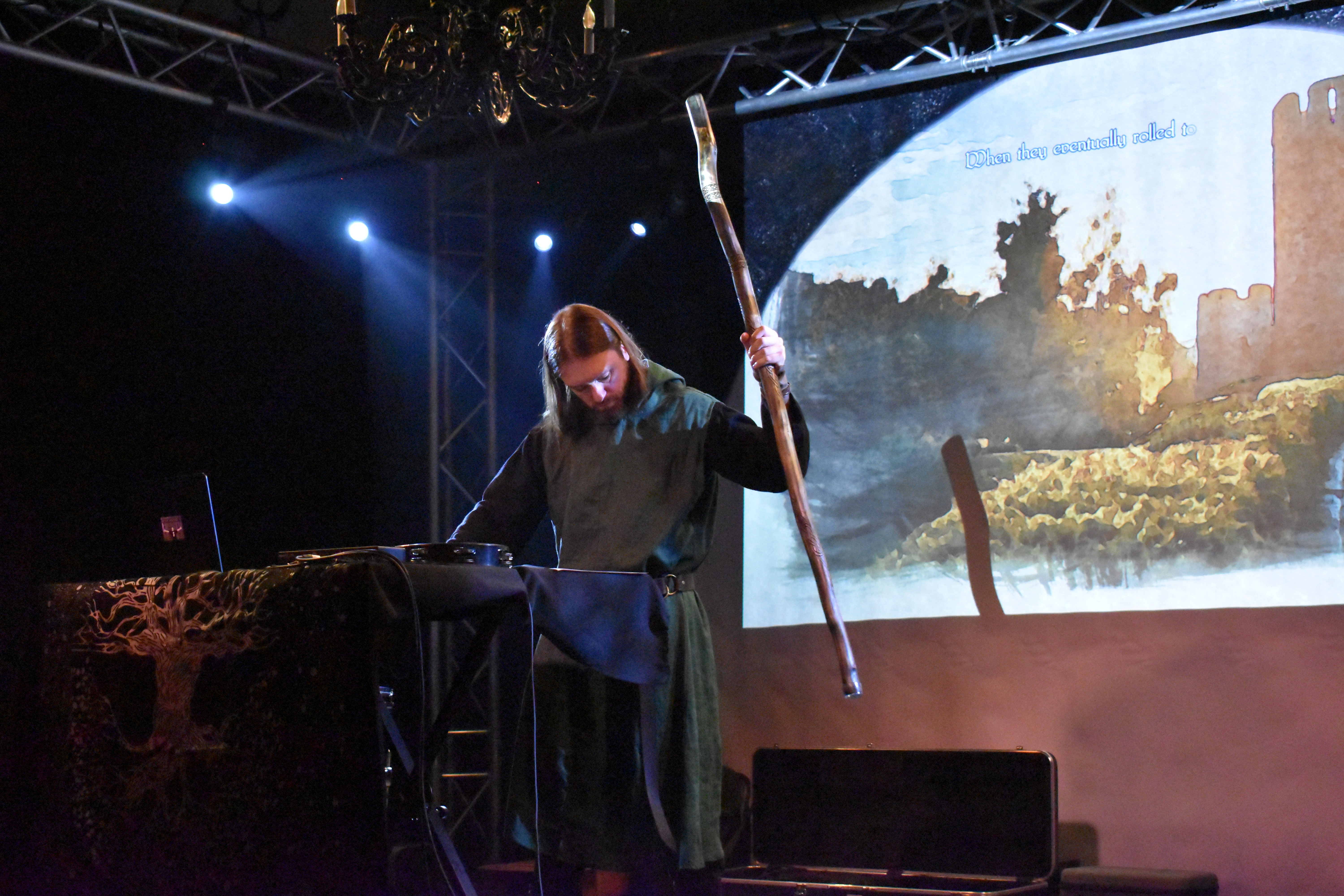 Le musicien me confiera plus tard sa crainte que l'ensemble ne soit pas assez lisible, mais dans une petite salle comme celle-ci, c'est au contraire une scénographie qui fonctionne à merveille. Celui-ci ne reste pas inactif, et alterne au fur et à mesure des morceaux entre clavier, guitare, bourdon de mage et autres percussions. Ceux-ci nous accompagnent d'un chapitre à l'autre, d'une ambiance champêtre aux villes tentaculaires, jusqu'au stimulant froid du nord – en passant par l'inévitable niveau dans les égouts. The Wanderer a trouvé la recette idéale pour nous immerger dans son univers comme pour entamer cette journée de pérégrinations musicales.