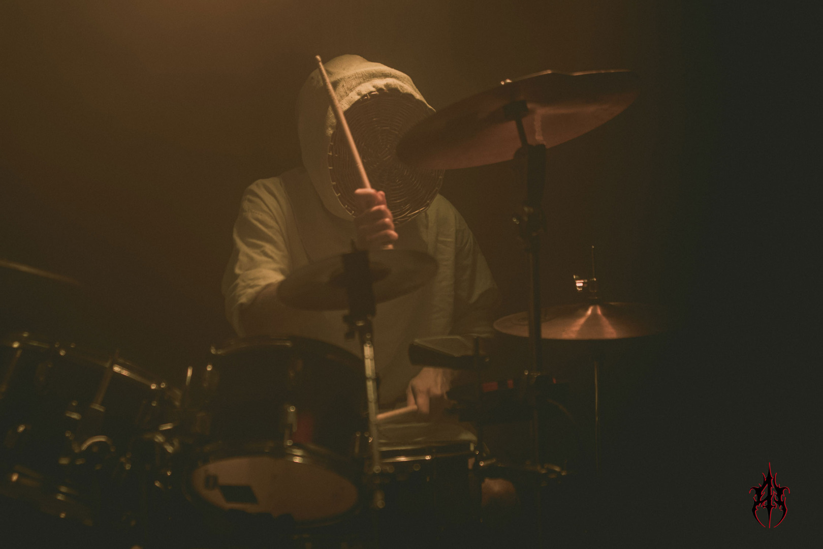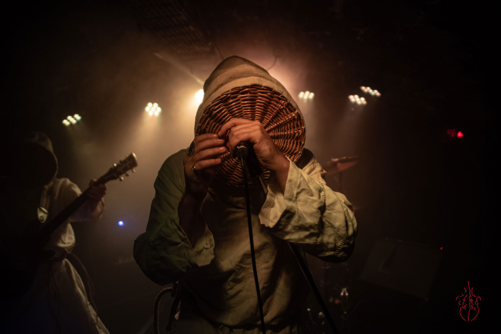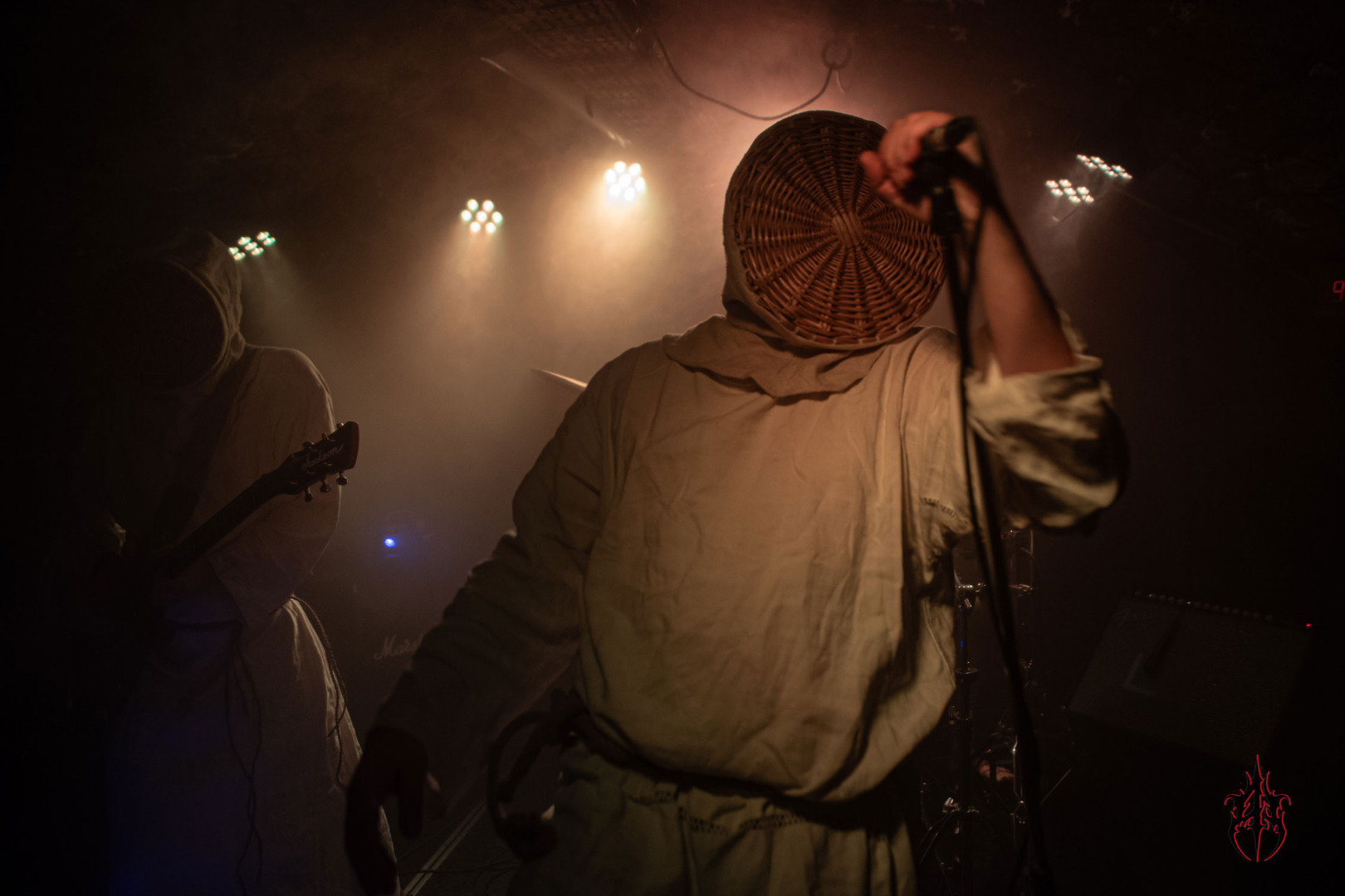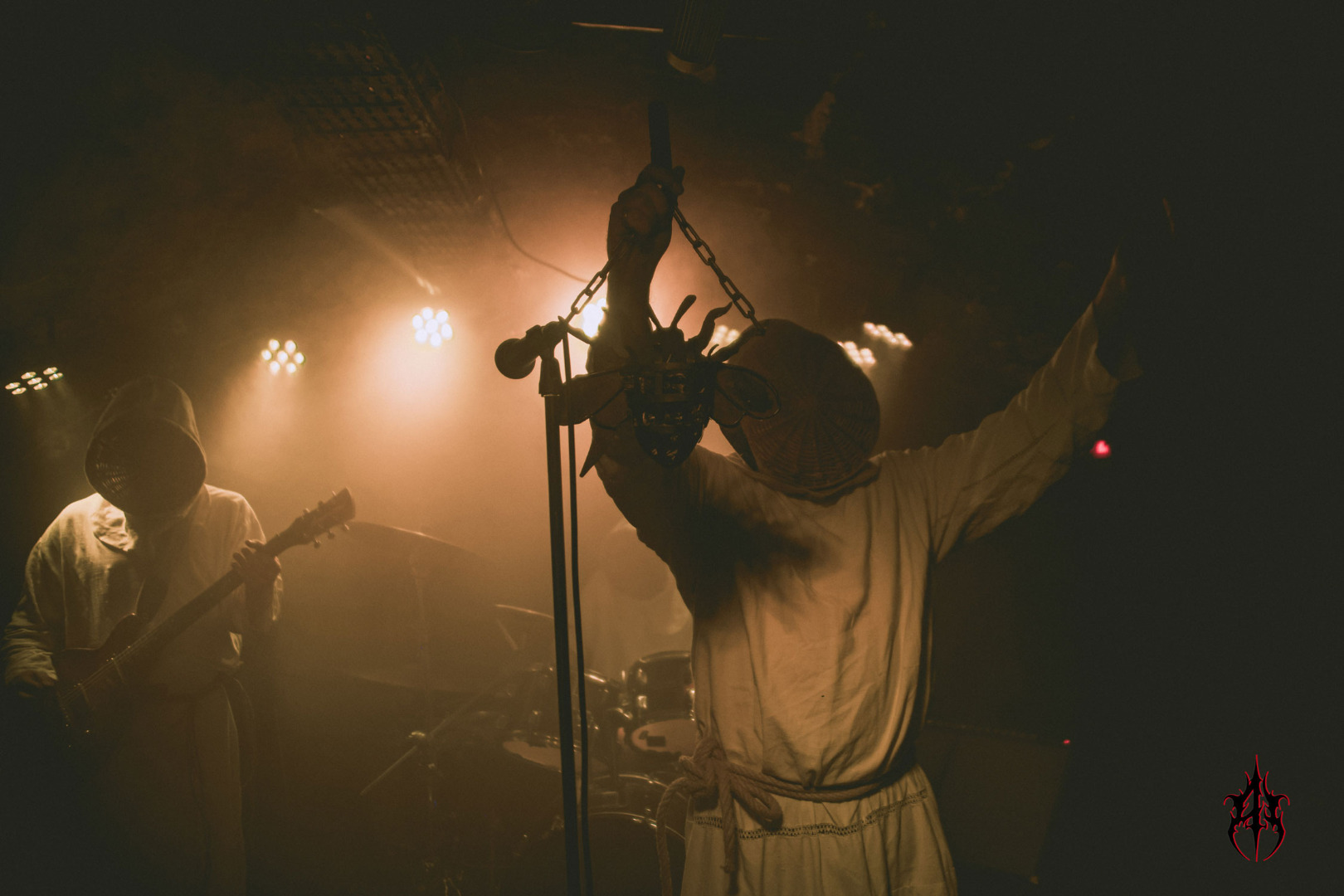 Je me place bien devant pour le set de Vígljós et éviter une nouvelle déconvenue. Et dès le début de « A Seed of Aberation », qui ouvre le concert, tout le charme des Caves s'exprime. Cachés sous leurs masques d'osiers et leurs robes blanches, à quelques centimètres du public, la présence hantée du trio est immédiatement prenante. Le son bien rugueux et tranchant de la guitare déchire l'air et plonge le public dans l'ambiance si particulière de Vígljós. Le chant fou de J, appuyé par une gestuelle et une attitude, est aussi maîtrisé que fascinant. Plus encore que le maquillage ou les capuches, les masques d'osier occultent toutes les expressions du visage et donnent l'impression de faire face à une folie brute et authentique. L'impression est d'autant plus prenante lorsque J produit ces espèces de hurlements aigus et possédés. L'esprit résolument punk qui se dégage de certains riffs (le centre de « Claviceps » et l'incroyable premier riff de « Delusions of Grandeur », notamment) font mouche à chaque occurence, le public se plie volontiers à cette énergie viscérale et sans artifices. Mais il y a aussi dans Vígljós un sens du groove, avec comme exemple parfait « Dance of the Bumblebee » et sa batterie en contre temps et le jeu sur la cowbell qui entraîne avec elle le public.