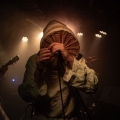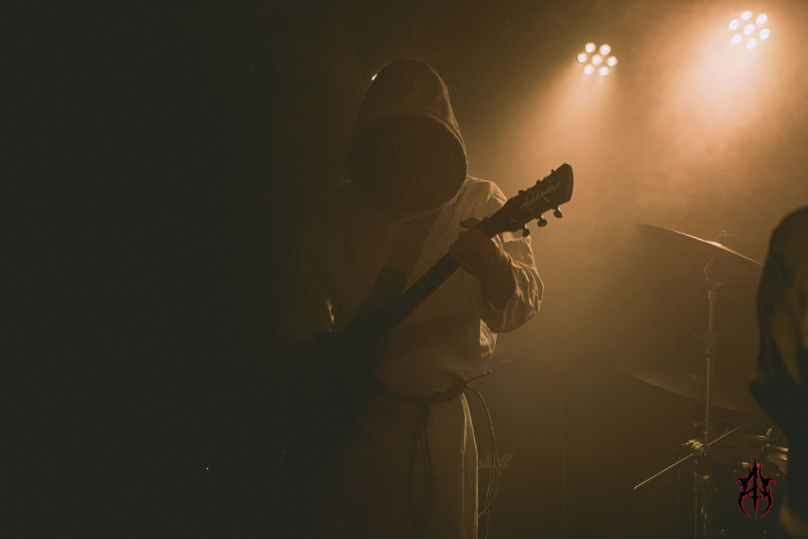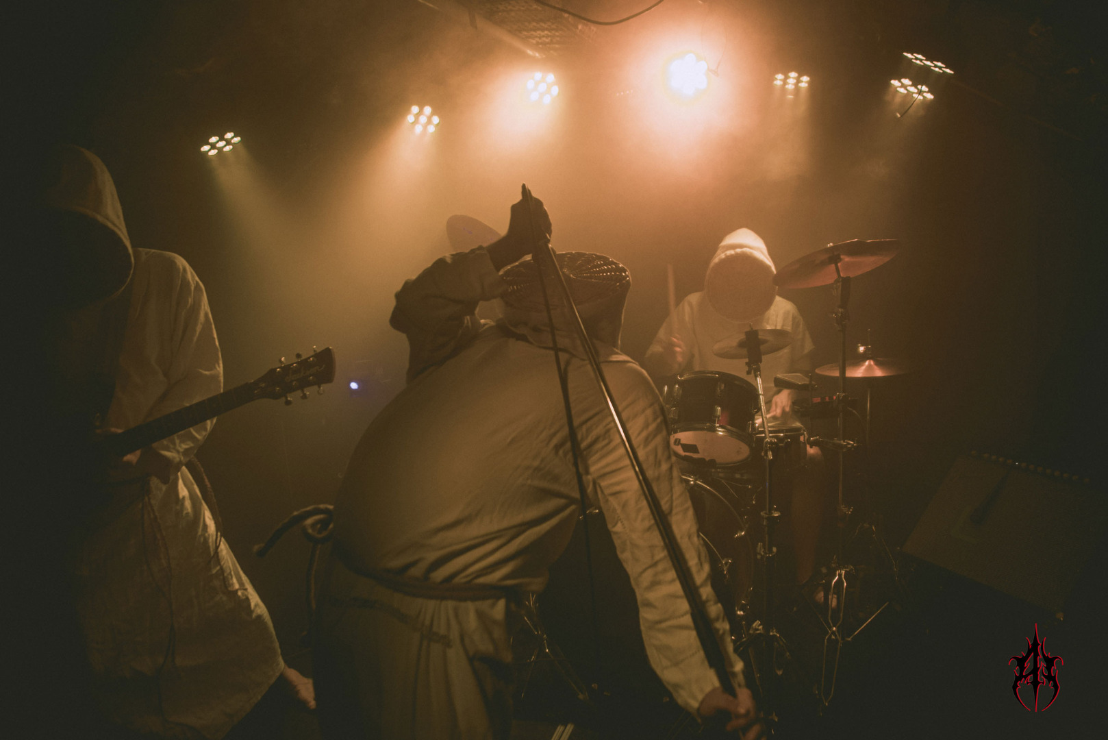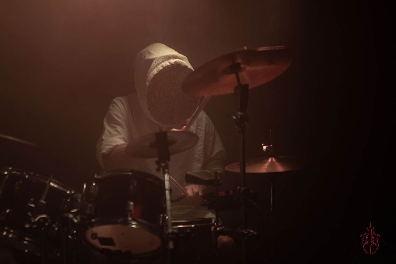 Je me place bien devant pour le set de Vígljós et éviter une nouvelle déconvenue. Et dès le début de « A Seed of Aberation », qui ouvre le concert, tout le charme des Caves s'exprime. Cachés sous leurs masques d'osiers et leurs robes blanches, à quelques centimètres du public, la présence hantée du trio est immédiatement prenante. Le son bien rugueux et tranchant de la guitare déchire l'air et plonge le public dans l'ambiance si particulière de Vígljós. Le chant fou de J, appuyé par une gestuelle et une attitude, est aussi maîtrisé que fascinant. Plus encore que le maquillage ou les capuches, les masques d'osier occultent toutes les expressions du visage et donnent l'impression de faire face à une folie brute et authentique. L'impression est d'autant plus prenante lorsque J produit ces espèces de hurlements aigus et possédés. L'esprit résolument punk qui se dégage de certains riffs (le centre de « Claviceps » et l'incroyable premier riff de « Delusions of Grandeur », notamment) font mouche à chaque occurence, le public se plie volontiers à cette énergie viscérale et sans artifices. Mais il y a aussi dans Vígljós un sens du groove, avec comme exemple parfait « Dance of the Bumblebee » et sa batterie en contre temps et le jeu sur la cowbell qui entraîne avec elle le public.