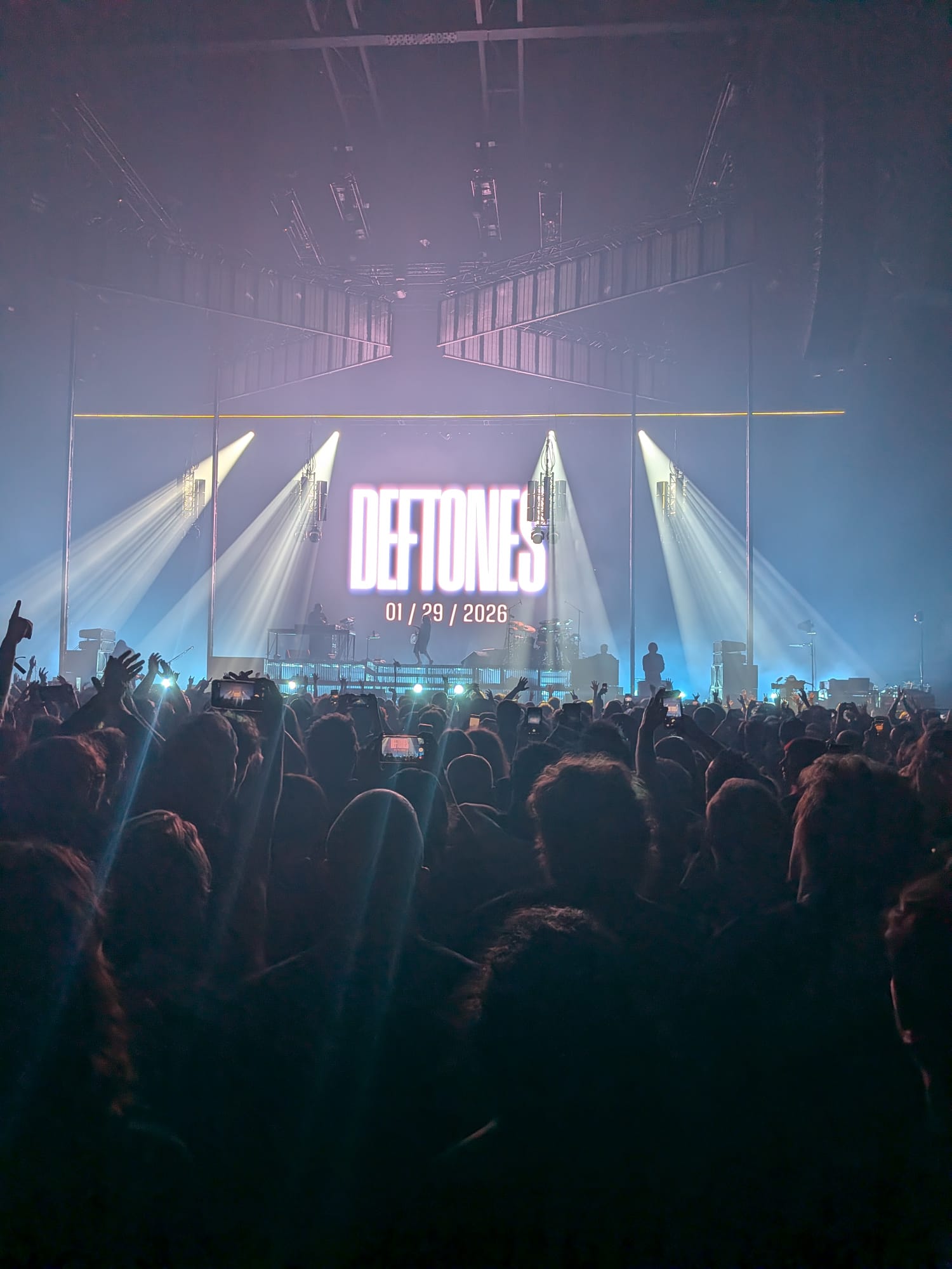 Aurélie Jungle : Première date européenne (et UK) des Deftones pour la tournée de private music ! C’était jeudi 29 janvier 2026 à l’Adidas Arena. Concert complet, évidemment, deux premières parties, démarrage à 19h00 et une arrivée des papas prévue pour 21h45. Et pour une fois : je suis en avance. Le temps de découvrir l’ensemble des subterfuges de l’Adidas Arena qui m’auraient bien emmerdés si j’avais été en retard. De prime abord, elle ne sent franchement pas bon cette salle. C’est évidemment, littéralement, un terrain de basket. La fosse est toute petite (sans parler de cette histoire de fosse or), la scène très basse et on se retrouve très vite à l’étroit. Sans vouloir lancer de rumeur ou de théorie fumeuse, il me semble que les « F » sur les poignets, qui font office de droit d’entrée dans la fosse, sont facilement reproductibles. Aurait-on, par hasard, été plus que prévus en fosse pauvre ?