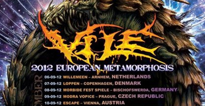 Pour finir arrive la tête d’affiche, les américains de Vile. A noter que pour l’achat d’un de leur T-shirt (à 10 euros, ce qui de base n’est pas cher) , le CD du dernier album est offert et le groupe propose de lui-même de le dédicacer, de vrais commerciaux efficaces dans l’âme ! Le groupe commence son set et ce qui frappe d’entrée, c’est la basse du bassiste, 7 putains de cordes, et il s’en sert le con ! Je vois pas trop bien l’intérêt pour jouer du death metal et encore plus quand on joue dans une cave, mais bon... Enfin ne soyons pas mauvaise langue, le son et clair ce soir, ce qui permet de nous prendre le son de Vile droit dans la tronche ! Toujours peu de monde mais le groupe est motivé et enchaine les titres avec le sourire. Ça commence à se remuer dans le pit, malheureusement au bout de 30 minutes le groupe est contraint d’annoncer son dernier morceau, faute à une horaire tendue, au grand damne du batteur qui a l’air de n’être que déception à cette annonce… Qu’importe, le final est exercé magistralement avec force et brutalité ! Enorme concert de Vile auquel il manquait juste un public plus nombreux pour permettre l’étincelle magique, mais bon on commence à avoir l’habitude dans la région …